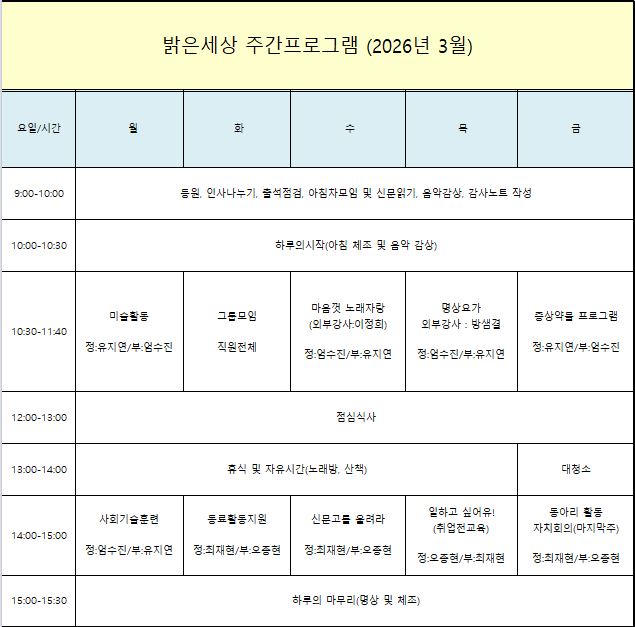 ¾È³çÇϼ¼¿ä. ¹àÀº¼¼»óÀÔ´Ï´Ù. ^^ ¹àÀº¼¼»óÀÇ 2026³â 3¿ù ÇÁ·Î±×·¥À» ¾È³»Çص帳´Ï´Ù. ÀÌ´Þ ¹àÀº¼¼»óÀÇ ÇÁ·Î±×·¥¿¡ ÀÌ¿ëÀÚ ¿©·¯ºÐµéÀÇ ¸¹Àº °ü½É°ú Âü¿© ºÎʵ叮°Ú½À´Ï´Ù.