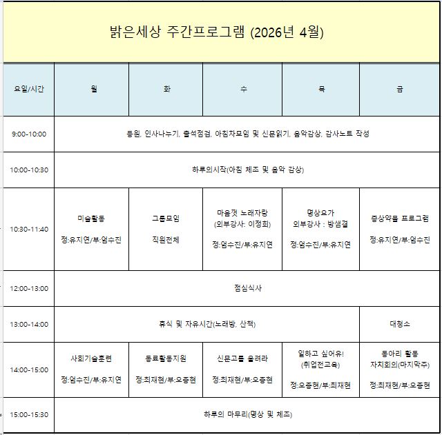 ¾È³çÇϼ¼¿ä. ¹àÀº¼¼»óÀÔ´Ï´Ù. ^^ ¹àÀº¼¼»óÀÇ 2026³â 4¿ù ÇÁ·Î±×·¥À» ¾È³»Çص帳´Ï´Ù. ÀÌ´Þ ¹àÀº¼¼»óÀÇ ÇÁ·Î±×·¥¿¡ ÀÌ¿ëÀÚ ¿©·¯ºÐµéÀÇ ¸¹Àº °ü½É°ú Âü¿© ºÎʵ叮°Ú½À´Ï´Ù.